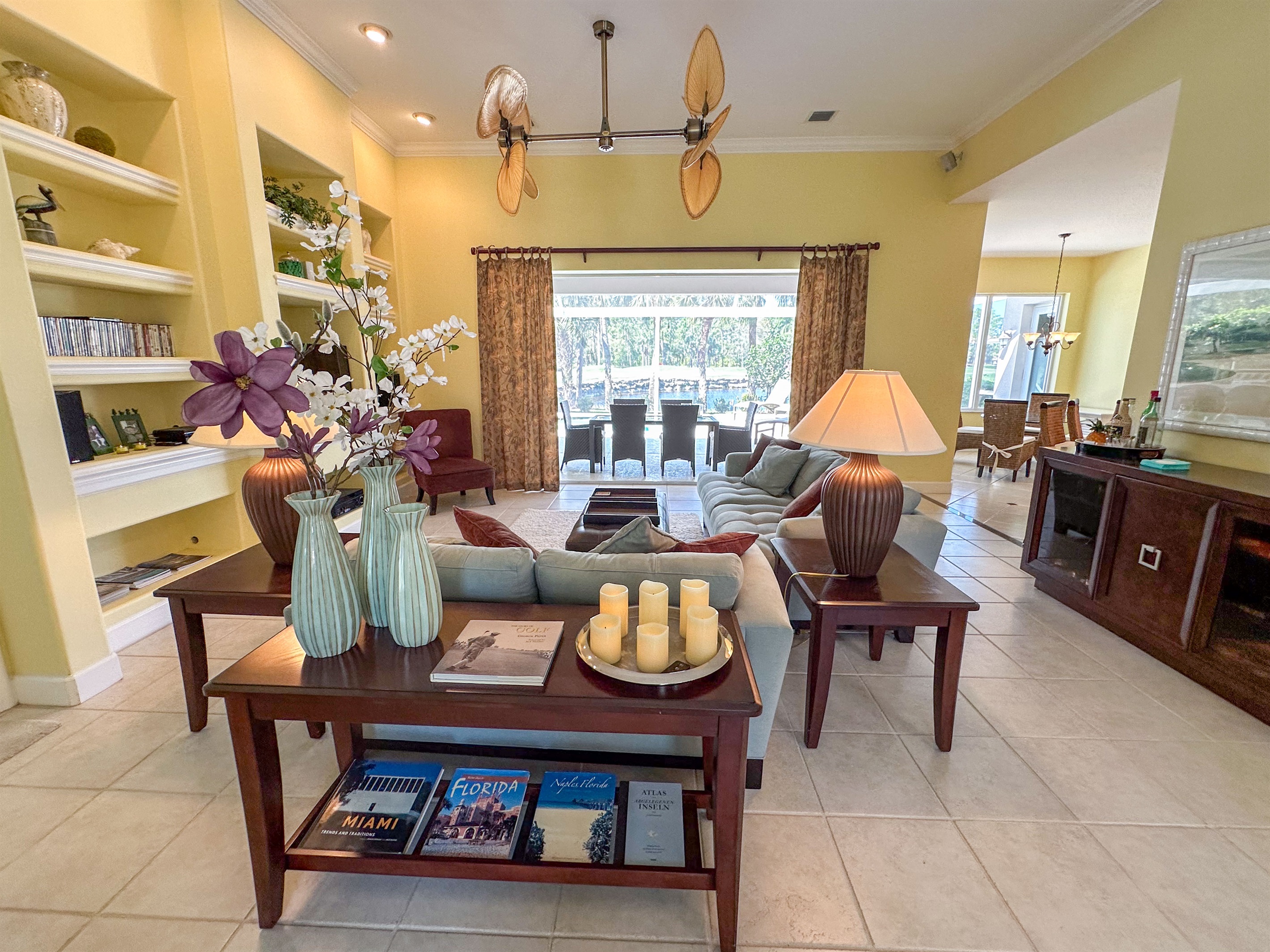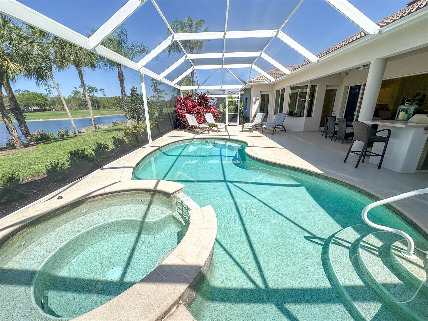 This stunning residence boasts a wonderful pool, hot tub, barbecue and dining area within the screened lanai while offering breathtaking views of the golf course and lake right off the backyard. Enjoy unparalleled vistas of hole number 6 and the serene green spaces. The home features a 2-car garage and a welcoming front entrance leading to an airy, sunlit living room, spacious kitchen, a Florida room, den, and dining area. This lovingly and well-maintained home boasts elegant décor, an open floorplan with three generously sized bedrooms, a den, and three full bathrooms, along with a well-equipped, open-concept kitchen. Experience resort-style living and fall-in-love with this exceptional property and all the amenities available at Vanderbilt Country Club.